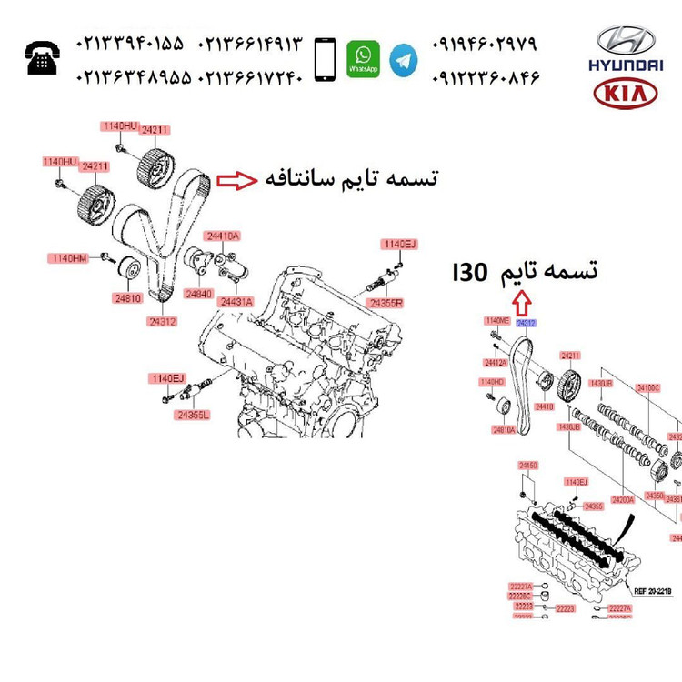 اکثر خودروهای هیوندای و کیا دارای زنجیر تایم هستند که نیاز به تعویض ندارند، مدل هایی دارای تسمه تایم شامل ورنا ۱۶۰۰، آونته، ای سی، سراتو ال دی با موتور دو هزار سی سی ،. سانتافه اپتیمای ۲۷۰۰ سی سی ،. اسپورتج کی ام، توسان جی ام با موتور ۲۷۰۰ سی سی دارای تسمه تایم هستند،. تسمه تایم تمام مدل ها با مناسب و با ضمانت اصلی بودن موجود می باشد.